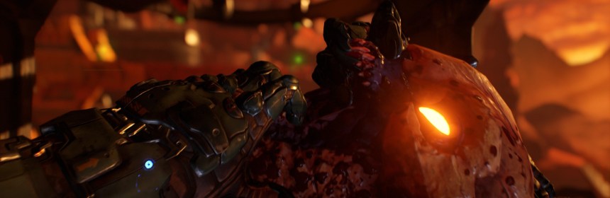 Mechanically this setup goes quite a bit deeper than its predecessors, even further than just adding impressive verticality. Starting with a humble pistol you’ll find all of the familiar DOOM armaments, from shotguns to rocket launchers to plasma rifles, but also new offerings like a heavy assault rifle and a high-impact Gauss cannon. All of these weapons can dispatch your slavering foes but damaging them to the brink of death also puts them into a state where they can be glory killed with your bare hands. This is core to the combat because glory killed enemies drop additional health or ammo necessary to keep your relatively small pools filled, so instead of engaging a room of monsters from the doorway you’ll need to be weaving through the pack, ripping and tearing to stay topped off.