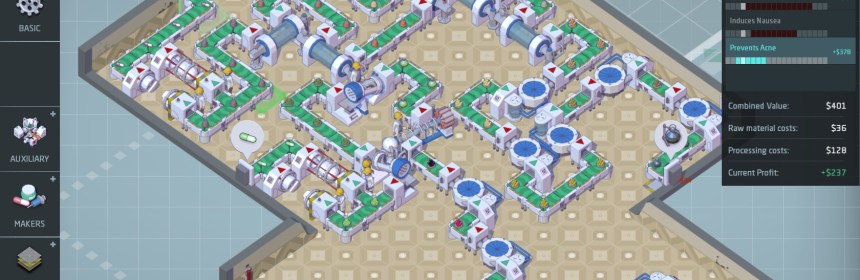 I love puzzle games, but I’m not afraid to admit when they get to be too much for me. SpaceChem is a perennial favorite of mine that I burned out on way before the end, for example. Big Pharma shares certain similarities with SpaceChem, but with a layer of corporate management on top of the mind-bending puzzles. It’s an interesting combination, and also a very exhausting one.