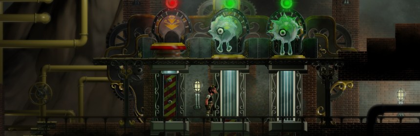 The tutorial portion of the game covers the basic mechanics, including running, jumping, yanking chains, hopping on enormous buttons, cranking enormous cranks, and splashing water everywhere. Most puzzles are going to center around getting a machine to do something, by opening valves or filling tanks or alligning nozzles or other mechanical puttering. You’ll either need the help of Fluros to make it happen, or you’ll need to rid yourself of meddlesome Fluros to keep the machines working right. How you do that will depend on your understanding of the machine’s operation, your tools at hand, and your ability to struggle against the game’s dodgy physics.