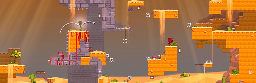 We’re not going to talk about the multiplayer though, because there’s enough wrong with this game that no amount of buddies can make it better. I can forgive most platforming sins if the movement is solid but your character in Bloody Trapland toddles around lazily and has a depressingly weak jump. You can wall jump but it’s the same anemic launch and scaling a single wall is impossible thanks to agonizing diminishing returns on your jumps. There’s also some weird conditional double jump that I still haven’t figured out, which is a pretty big red flag if your game can’t clarify how a central ability works after thirty minutes and two dozen levels. Lastly there’s a slide for scooting under hazards and tight spaces but the hit detection is so garbage that it’s a total toss-up if it’s even going to work the way you think.